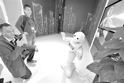 5月26日,参观者在2019中国国际大数据产业博览会上与5G+智能机器人进行拍照互动。记者 杨文斌 摄