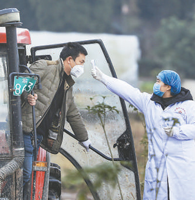 2月5日,重庆市梁平区仁贤镇卫生院医护人员为农机手进行体温监测。 |