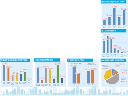 调查结果显示,疫情对小微企业造成了较大冲击。超过九成小微企业延迟了开工开业,近五成企业延迟时间超过两周。同时,还有很大比例企业仍没有确定开工时间表。其中,因抗击疫情统一延长假期是开工推迟的最主要原因。