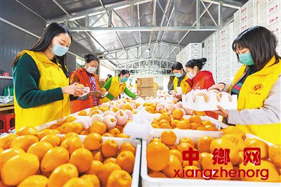 疫情防控期间,重庆市大足区中敖镇加福社区最忆加福柑橘种植专业合作社利用互联网发展电商、微商等方式,销售柑橘45万余斤,销售额近400万元。图为该合作社加工车间内,工人正在将柑橘称重、包装。