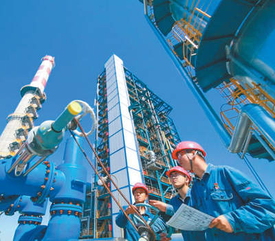 大庆石化技术人员检查生产设备。