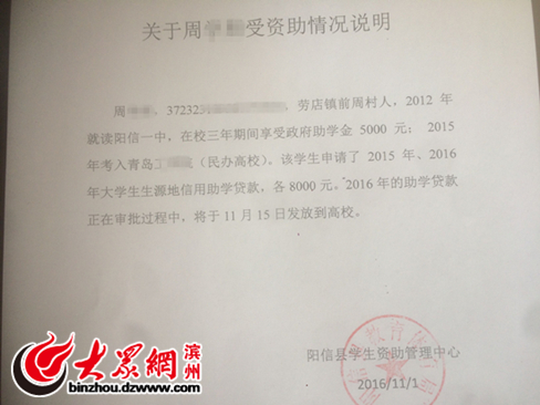 据了解,阳信县民政局很早已为其办理了低保,并提供了5000元慈善救助金。另外,周某某在阳信县一中上学三年期间,一直享受政府助学金5000元。在周某某考上青岛某高校后,阳信县教育局分别在2015年和2016年为他办理了两次8000元助学贷款,共计16000元。2016年助学贷款将于11月15日发放到高校。2016年9月份,在周秀云丈夫周兴三被查出肺癌后,阳信县劳店镇政府便将周秀云一家列为困难家庭,并给与周秀云2000元困难家庭救助金。