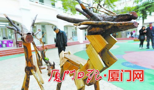木雕、软陶、丙烯画……走进一间间手工制作教室,130名来自海沧各个学校的海娃们根据自己的兴趣,以灾后废弃树木、瓦片等物品为材料,聚精会神地制作着各种各样栩栩如生手工艺品。
