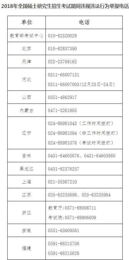 人民网北京12月18日电 据教育部网站消息,2018年全国硕士研究生招生考试将于2017年12月23日-25日举行。为严厉打击涉考违法活动,严肃考试纪律,维护考生合法权益,确保考试公平公正,现公布2018年全国硕士研究生招生考试期间违规违法行为举报电话。