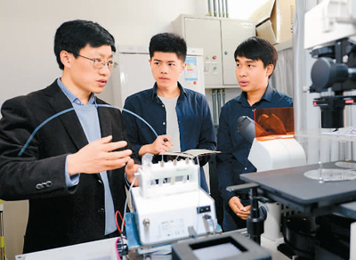 2017年3月28日,泰国留学生卡纳特(右)和同学在西安交通大学机械工程学院教授韦学勇(左)指导下进行生物微流控芯片研究。 新华社记者 李一博摄