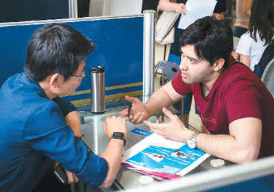2017年5月10日,在上海高校外国留学生就业专场招聘会上,华东理工大学的伊朗留学生迈赫迪(右)与企业代表交流。 杜潇逸摄(新华社发)