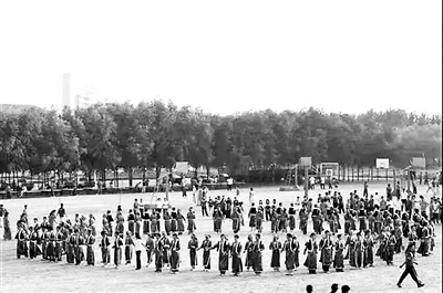 每天下午4点30分下课,张丽君会把学生都召集到操场上,一起跳羌舞。大家都换上民族服装,男生穿蓝色,女生穿红色。这是母松玲每天最喜欢的一段时间。100多名川籍学生手拉手围成大圈,广播里放着羌歌。有些本校学生也会加入他们的队伍,圈子越来越大,一首接着一首,可以一直跳下去。