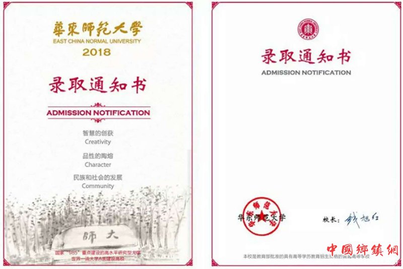 2018年的录取通知书简约、清新。以花纸为底纹,中间矗立着大师石。整个封面用大量白色铺陈,只寥寥几笔勾勒出花枝簇拥着大师石的画面,象征着华东师大人才辈出,并在“师大”的领导下成为国家栋梁。