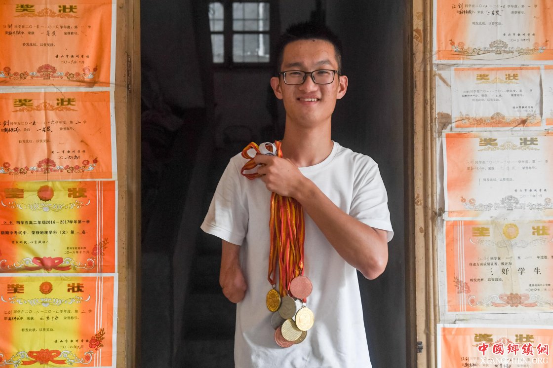 8岁那年,江剑在家门口玩耍时不幸被大卡车压断了右前臂。在人生的挫折面前,江剑选择了乐观和勇气。为了不耽误学习,他花了一年时间让左手可以熟练写字。在学校里,江剑不仅学习成绩优异,足球、跳远、短跑等体育运动也是他的强项。走进江剑的家,可以看到墙壁上贴满了他在不同时期获得的奖状,这些荣誉的背后是江剑的青春和汗水以及家人的陪伴和支持。