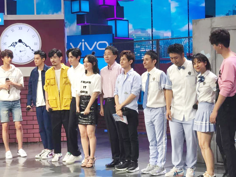 图为谢娜(左五)与川影院长罗共和(左六)在《快乐大本营》节目现场(视频截图)