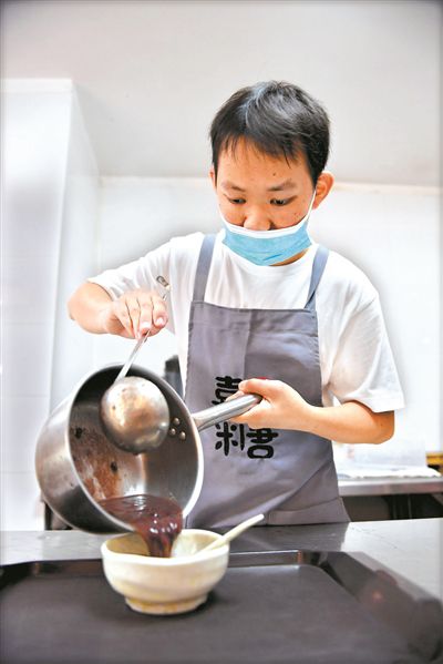 喜糖二楼是一家素食馆,中午食客颇多。“上面有客人点了一杯红豆沙哦。”店里的负责人收到了来自素食馆的订单。“我来,我来。”诗诗争先恐后地举起手来。虽然是一杯红豆沙,但是需要经过加热等程序。林林戴上口罩,小心翼翼地将一大勺红豆沙放入锅中加热,到时间后又十分小心地将其倒入粗瓷碗中。