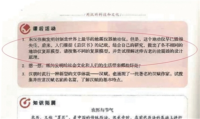 “通过这些要求旨在引导学生以实践探索的方式,更好地了解张衡及地动仪的相关知识,体会中国古人的智慧,增强民族自豪感,提升学生综合素质。”人教社称。