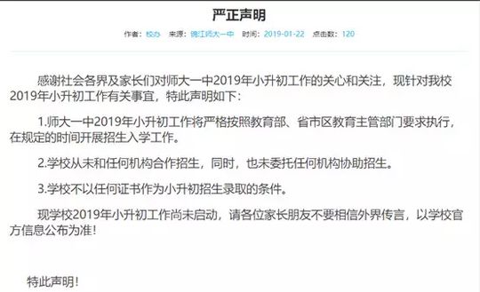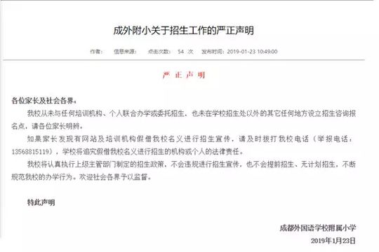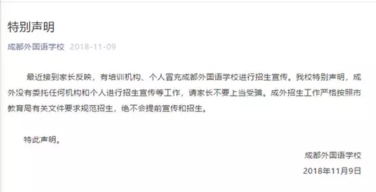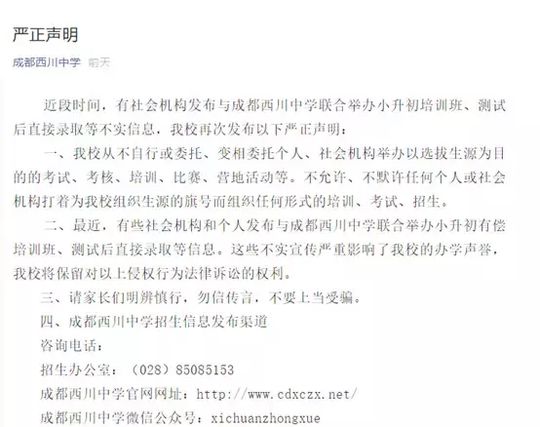 近日,成都嘉祥外国语学校、西川中学、天府四中、四川师大附属第一实验中学等中小学校纷纷在自己的官网或官微上发表严正声明,郑重声明自己学校从未自行或委托、变相委托个人、社会机构举办以选拔生源为目的的考试、考核、培训、比赛、营地活动等。不允许、不默许任何个人或社会机构打着为学校组织生源的旗号而组织任何形式的培训、考试、招生。