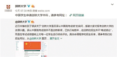 2018年10月,伯明翰大学官网宣布“自2019年起,中国学生可以直接用高考成绩申请伯明翰大学本科课程。”这条消息当时引起了极大关注,因为伯明翰大学是英国精英大学联盟“罗素集团”成员中第一所正式对外官宣认可中国高考成绩的大学。随后不少院校也对外发布了接受中国高考生的录取标准。最近,媒体又纷纷报道,备受瞩目的剑桥大学也宣布接受中国高考成绩,想必这个消息一定会让不少今年的高考生和家长兴奋不已,不过,不要高兴得太早,因为除了高考成绩的要求外,申请者还需满足其他一系列要求,包括语言和学术方面。但在3月25日,剑桥大学通过官方微博发布消息称,承认中国高考成绩并不是剑桥新闻,已执行数年,但剑桥的招生并不“唯成绩论”,而是在考试成绩基础上对每一位学生进行综合评估。具体申请程序和招生标准可参考学校招生网站。