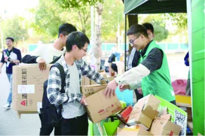 武汉理工大学学生将快递纸箱送到菜鸟绿色“双11”纸箱回收点