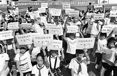 西安的小学生们举着向校园欺凌说“不”的标语,共同抵制校园欺凌。光明图片/视觉中国