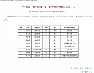 18日晚,华中师大一附中官网公示2020年第一轮教师招聘拟录人员名单,第一轮9名拟录人员中,6人是顶尖大学博士,其余为硕士,均来自清华、北大。公示9人中,清华、北大的毕业生有6人。