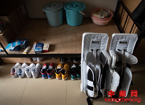11月15日,北京大学,校冰球队队员宋喆人的宿舍,冰球守门员的护腿放在他和舍友的球鞋旁。床上还放着消肿止痛的药物和冰袋。