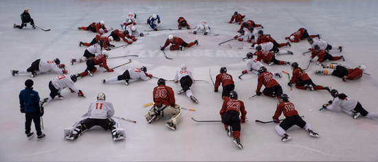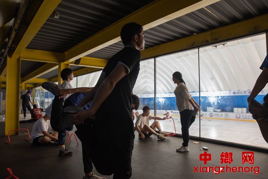 10月3日,北京五环外的一家冰上运动中心,训练结束后,人大冰球队的队员在场馆中做放松运动。