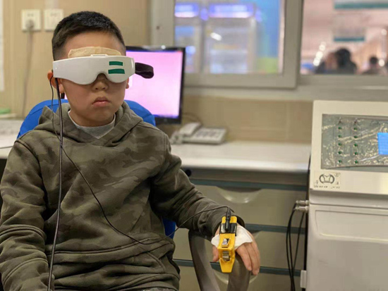 一名近视患儿遵医嘱在治疗室接受离子导入、低频脉冲、热敷治疗,缓解视疲劳,控制近视度数增长。