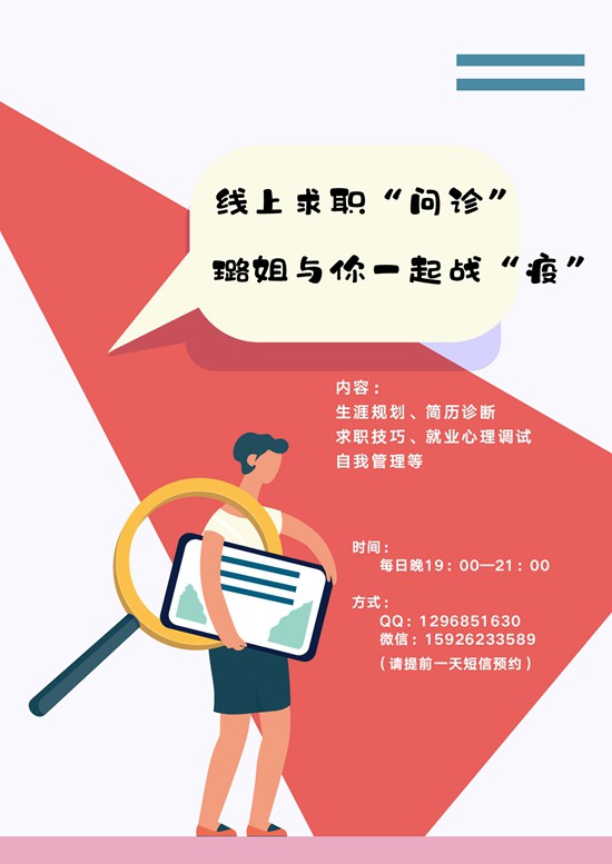 王璐是国家二级心理咨询师、高级生涯规划师,也是学校招就处咨询师。疫情期间,她还开设“璐姐云问诊”,每天晚上7点到9点进行线上“就业问诊”,帮助毕业生疏导疫情与就业带来的恐慌与焦虑情绪、修改简历。
