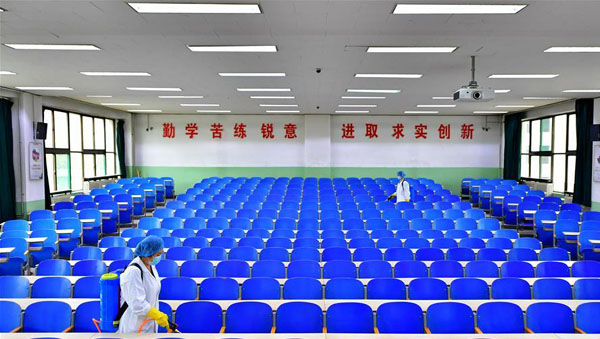 4月9日,山西农业大学的工作人员在教室内开展消杀作业。 据山西省教育厅消息,山西省高校本硕博毕业年级将于4月10日起错峰分批开学。山西省各高校全面推进封闭管理、分散住宿、教职工培训、公共场所消杀等各项开学准备工作,保障学生安全复课。 新华社记者 曹阳 摄