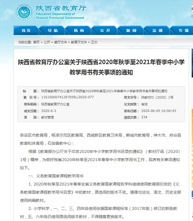 全省中小学教辅材料的选用,除义务教育统编三科道德与法治、语文、历史外,其他教辅材料要严格按照《陕西省中小学教辅材料推荐目录》规定的科目、版本、适用年级进行征订。