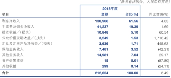 报告期内,交通银行实现利息净收入1309.08亿元,同比增长4.83%,在营业收入中的占比为61.56%;实现手续费及佣金净收入412.37亿元,同比增长1.69%,在营业收入中的占比为19.39%。