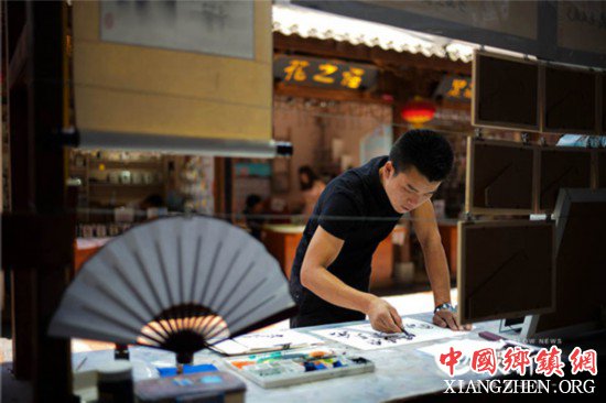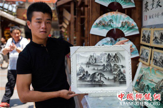 大概半月前,翟云川从四川遂宁来到重庆洪崖洞摆摊儿画画。他能将你画进洪崖洞,这是他和恩师宋友平独创的民间艺术——“人名”山水画。约两三平方米的摊位,挂满了各式各样的山水画。“唐伯虎”、“周星驰”等人名,他都能巧妙地画进洪崖洞的风貌中。