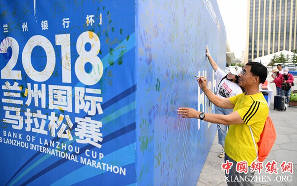 图为王美琪在2018兰州国际马拉松赛的签名墙上签下自己的名字(2018年6月8日摄)。