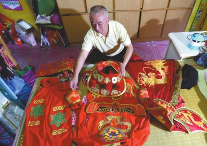 “这些衣服都是我自己做的,能省就省一点。”蒋福昌说,起初学习变脸时,一下就花了几千元拜师、购置道具,那是他当时好几个月的工资。后来,第一套演出服穿旧了,他就开始试着自己照着样子,买布料、设计、裁剪、缝制。“我从14岁开始就在制衣厂工作,也算发挥特长”。