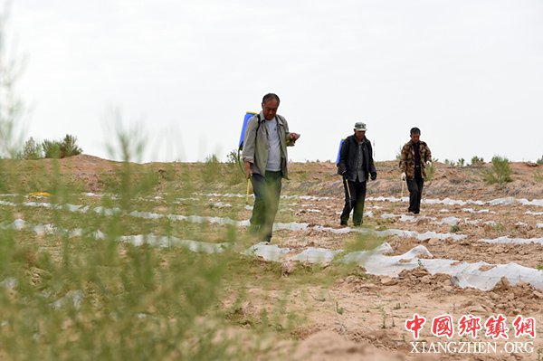 在古浪县黄花滩移民区流转的土地上,贺中强(左一)和林场职工及当地村民一起在枸杞种植地里劳动(5月20日摄)。