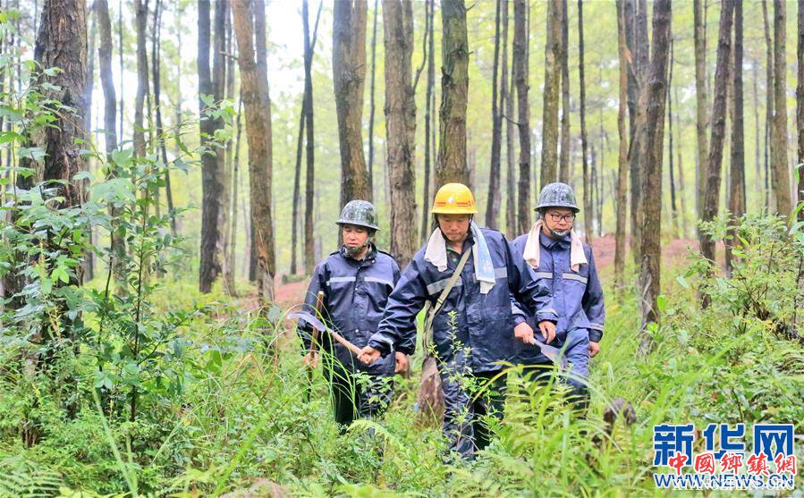 7月31日,符声强(中)和同事们用随身携带的刀具清出巡山的路。今年38岁的“绿林好汉”符声强,是位于江西省吉安市永丰县的古县林场的一名护林员,从事护林工作已有20余年。他的主要工作是通过巡护和宣传,防止偷砍盗伐、森林火灾等情况。多年来,符声强和同事们一年四季以森林为家,寒暑不惧,风雨无阻,守护着林场。 新华社发(刘浩军 摄)