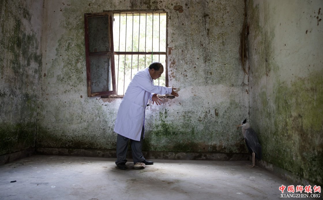 8月6日,在江西省九江市都昌县多宝乡鄱阳湖候鸟救治医院,院长李春如在和一只接受救治的苍鹭“对话”。