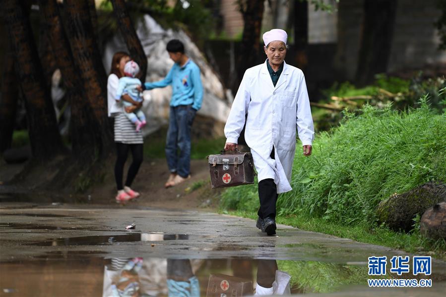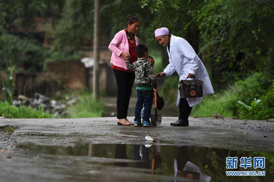 何世英提着用了多年的药箱从村口的路上走过(8月15日摄)。新华社记者陈斌摄