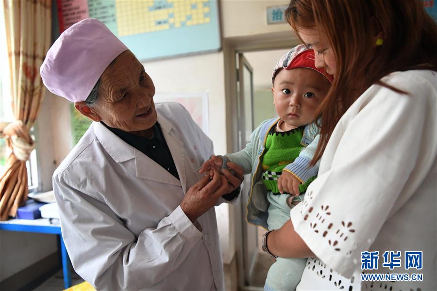 何世英在村卫生室查看一名婴儿的健康情况(8月15日摄)。新华社记者陈斌摄