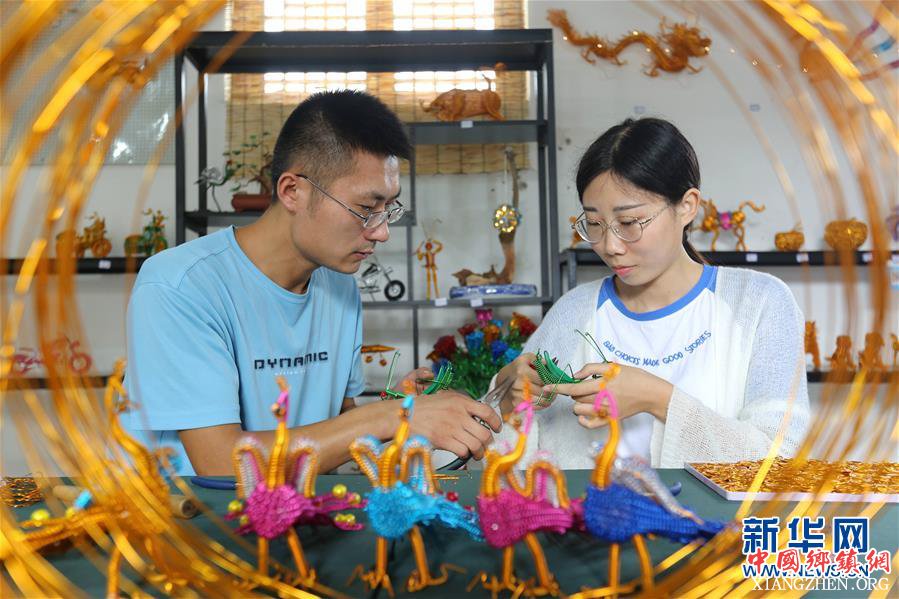 8月30日,蔡兆旺在工作室制作铝艺编织工艺品。