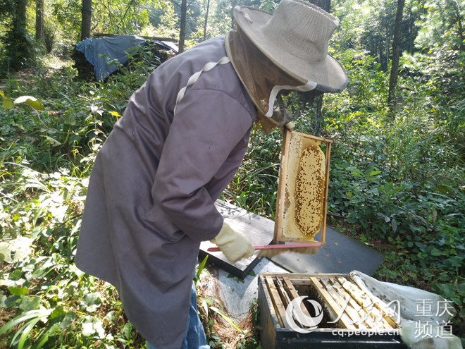 罗祥鱼在查看蜂箱蜂蜜的情况。