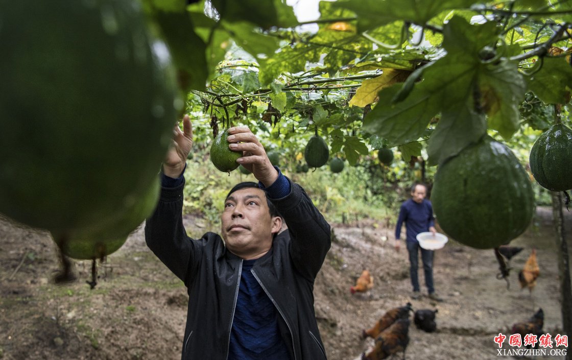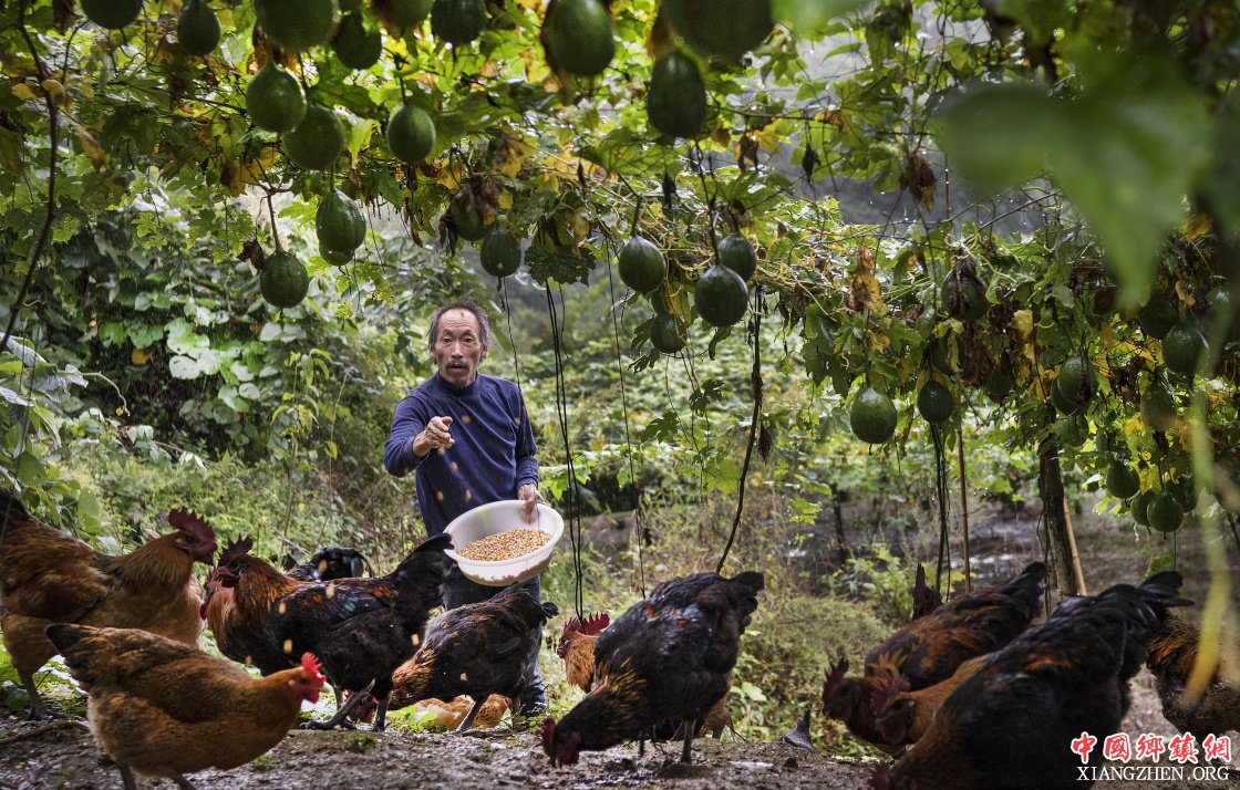 9月16日,杨修华的哥哥杨修军在瓜蒌园里为饲养的土鸡喂食。