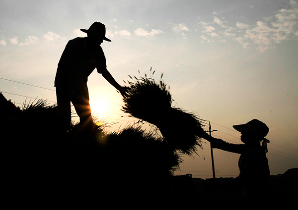 6月26日,在甘肃省庆阳市环县环城镇五里屯村,农民搬运收割机收下的麦子。