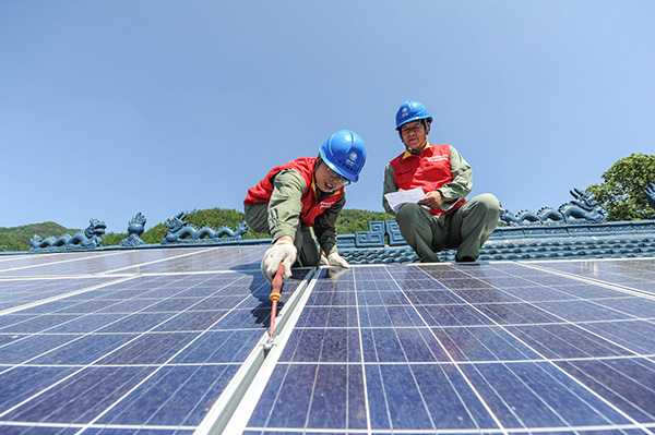 8月6日,供电部门工作人员在何斯路村的居民光伏屋顶上,为即将并网的屋顶光伏电站安装调试并网设备。