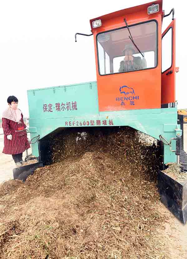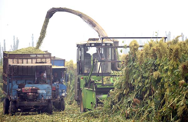 9月24日,工人在永清县刘街乡胜利村搅拌粉碎后的籽粒苋。