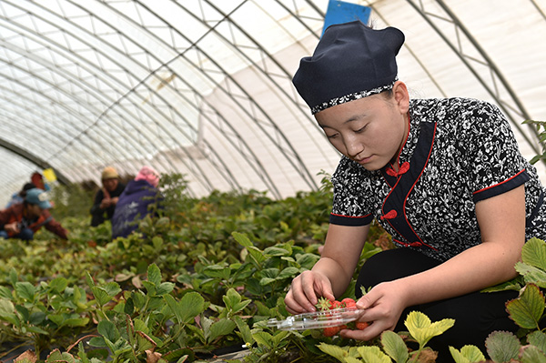 在宁夏西吉县龙王坝村,当地村民通过大棚种植草莓吸引游人采摘(10月13日摄)。