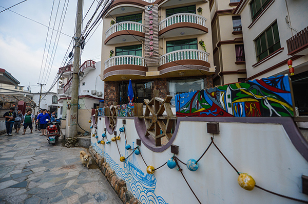 田岙村的许多房屋外墙上都画上了鲜艳的渔民画,凸显渔村特色(10月27日摄)。