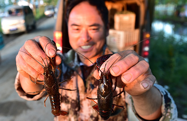 5月16日,二郎口镇曹埠村农民在展示从稻田里收获的小龙虾。