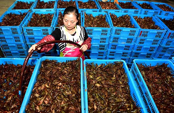 5月16日,二郎口镇曹埠村农民在给等待装运的小龙虾浇水。