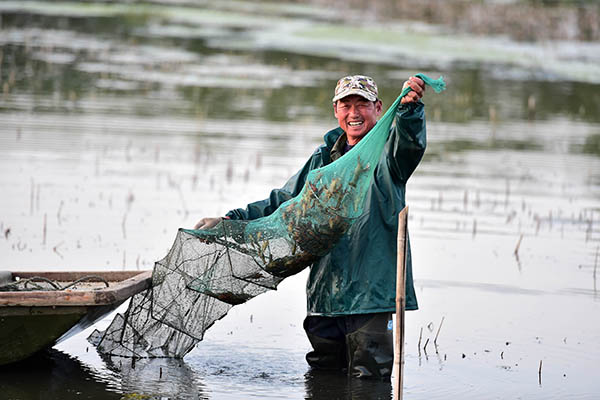 5月16日,二郎口镇曹埠村农民从稻田里收获小龙虾。
