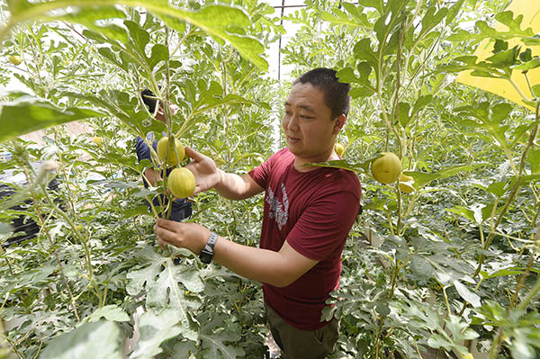 5月30日,宁夏农垦集团平吉堡农场农技人员在大棚里查看吊瓜的生长情况,这里的大棚均采用水肥一体化滴灌技术。