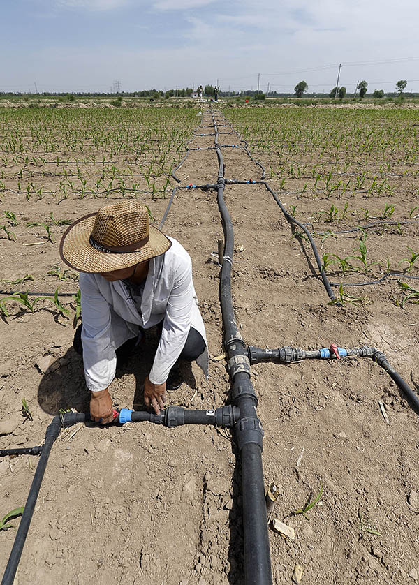 5月30日,宁夏农垦集团平吉堡农场工作人员在田间打开控制水肥混合液的闸门,对作物进行水肥滴灌。