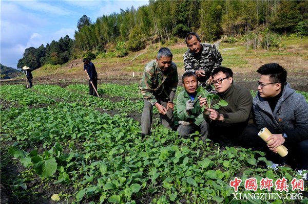 11月23日,福建南平市农技员江鑫(右二)与纪委下派驻村干部陈瑞辉(右一)在延平区南山镇前村指导贫困农民种植油菜,增加冬季收入。新华社记者 张国俊 摄
